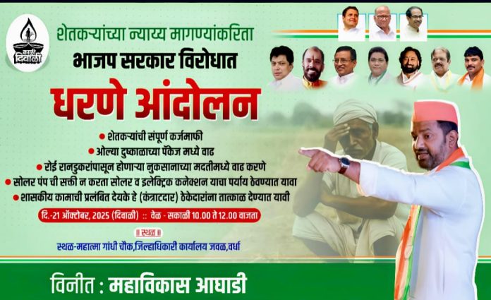 शेतकऱ्यांच्या विविध मागण्यांकडे शासनाचे दुर्लक्ष होत असल्याने राष्ट्रवादी काँग्रेसचे खासदार अमर काळे यांच्या नेतृत्वाखाली २१ ऑक्टोबर रोजी सकाळी १० ते १२ वाजेपर्यंत जिल्हाधिकारी कार्यालयासमोर महात्मा गांधी पुतळ्यासमोर महाविकास आघाडीचे धरना आंदोलन होणार आहे.