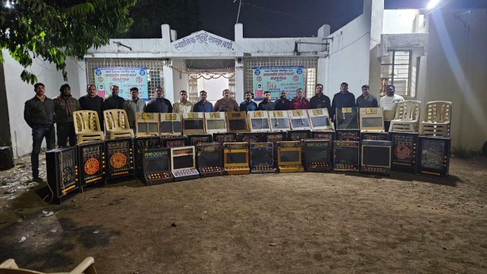 छाप्यावेळी आरोपी जुगारात गुंग असल्याचे आढळून आले. घटनास्थळावरून ३५ इलेक्ट्रॉनिक जुगार मशीन, प्लास्टिक टोकन्स तसेच जुगारातून मिळालेली ६८ हजार ५६० रुपयांची रोकड असा एकूण ७ लाख ८३ हजार ५६० रुपयांचा मुद्देमाल हस्तगत करण्यात आला.