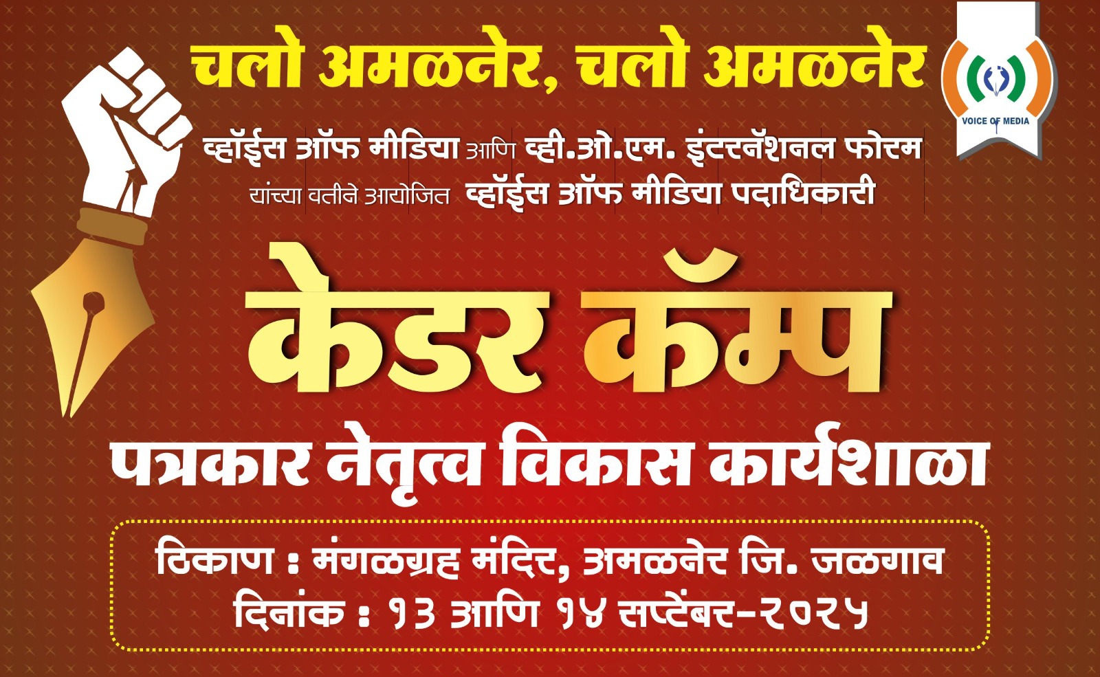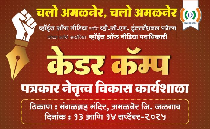 पत्रकार सदस्य व पदाधिकारी हिच संघटनेची खरी ताकद आहेत. त्यांच्या कार्यक्षमता, जाणीव, आणि संघटनात्मक कौशल्य वृद्धिंगत करण्याच्या उद्देशाने व्हॉईस ऑफ मीडियातर्फे दि. १३ व १४ सप्टेंबर २०२५ रोजी सकाळी ९ वाजेपासून अमळनेरात ख्यातनाम श्री मंगळग्रह मंदिर परिसरात राज्यस्तरीय ‘व्हॉईस ऑफ मीडिया पदाधिकारी केडर कॅम्प’ आयोजित करण्यात आला आहे. कार्यक्रमाचे उद्घाटन माजी मंत्री तथा आमदार अनिल पाटील यांच्या हस्ते होणार आहे.खासदार स्मिता वाघ प्रमूख मार्गदर्शिका असतील.