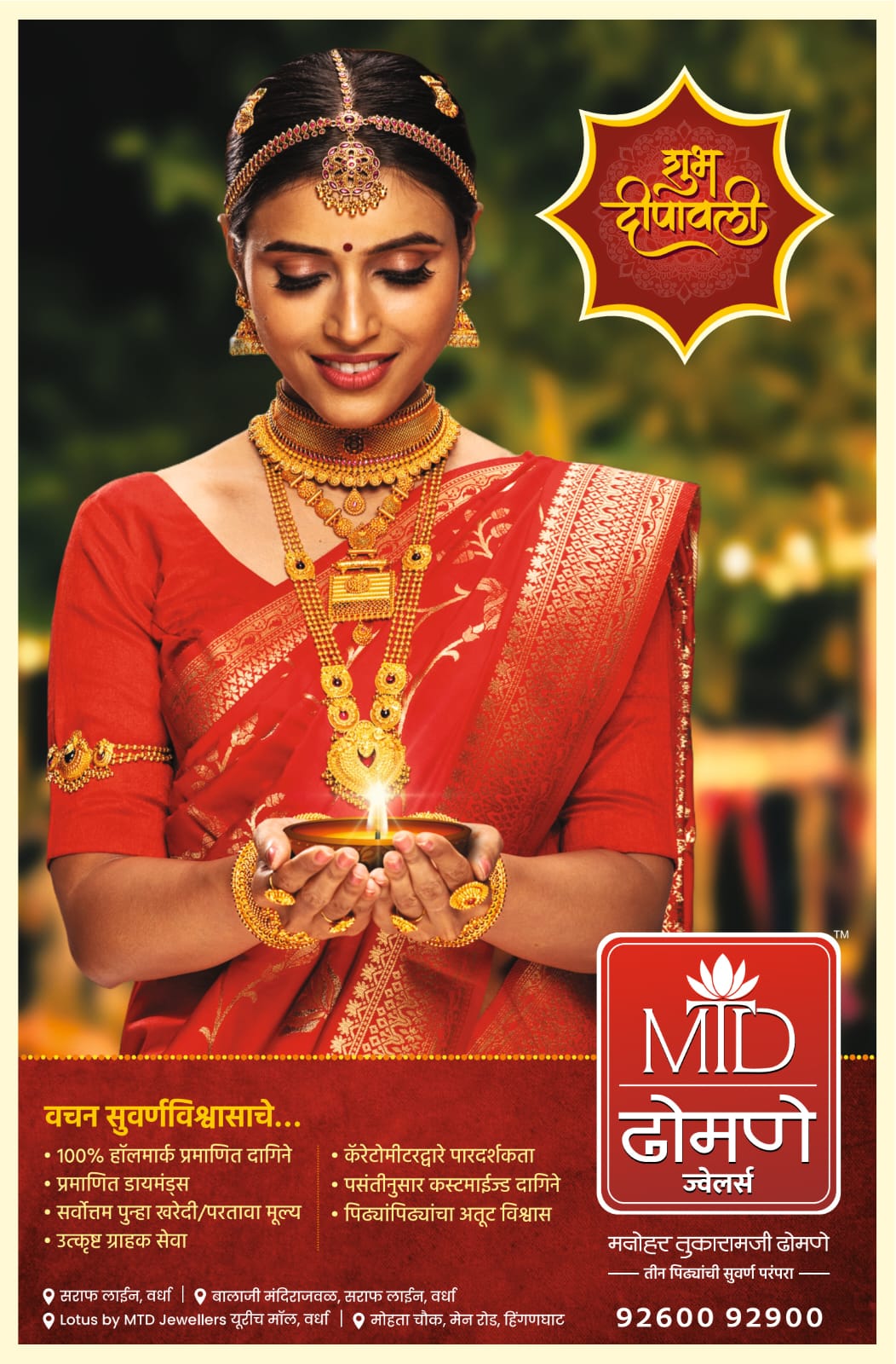 वर्धा समस्त जनतेस दिवाळीच्या हार्दिक शुभेच्छा By GNN - October 23, 2025 47 Share WhatsAppTelegramXFacebook वर्धा जिल्ह्यातील नागरिकांना दिवाळीच्या हार्दिक शुभेच्छा